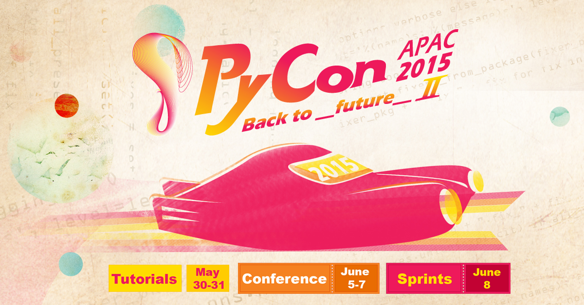 這次PyCon APAC 2015的整體設計風格, 我們特別嘗試了與以往不同的風格, 呼應 電影 - 回到未來2 的電影場境中回到 2015探索未來, PyCon APAC 2015 更希望能帶給會眾更多驚喜與視覺連結。