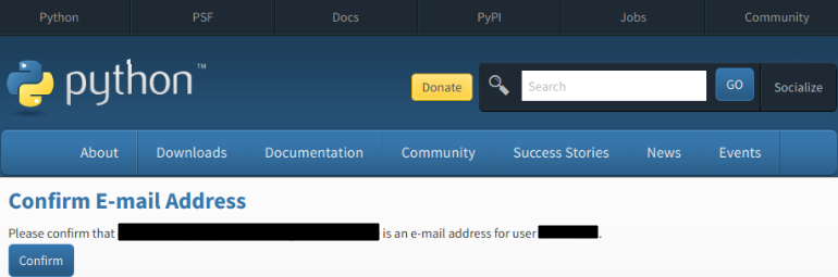 接著去電子信箱確定收到標題像是 「 [python.org] Please Confirm Your E-mail Address 」 的信件之後,點下裡面的確認連結:
